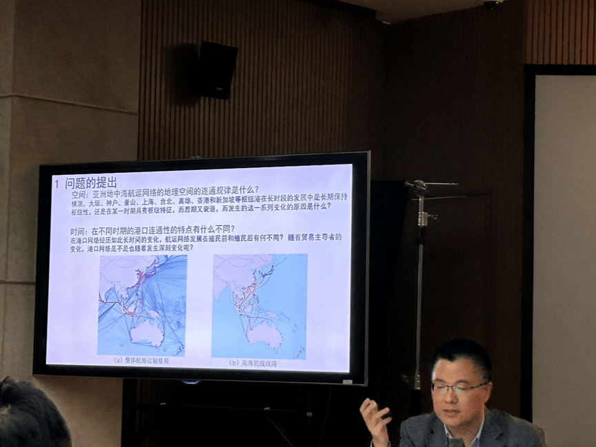 接着,王教授解释了枢纽港功能演化,不变的是新加坡、香港长期处于枢纽港地位,变化有横滨、神户等日本港口在20世纪90年代后枢纽性开始下降,以及2001年中国加入WTO,特别是2008年经济危机后,香港、深圳、上海等大批南海北部港口枢纽性提升并成为跨区域航运的主要参与者。随后,王教授解释了航线连通特征,从航线连通数量的变化来看,航线联系变化较为年度变化较大,但较高层级的航线联系,主要发生在香港、新加坡和日本港口之间。中国沿海港口联系为上海-香港-东南亚港口的联系,东南亚港口主要为与新加坡的联系,二战后,跨区域港口联系重心经历由日本对外联系为主向中韩两国对外航线联系为主转变。集装箱是海运贸易主要形式,贸易航运依托于腹地和经济需求,南海南部国家与中国北部地区经济联系不深。然后,王教授按照二战之前和二战之后的演变顺序讲述了港口社团结构。二战之前,香港组团和上海组团融合为香港-上海组团,日本港口范围扩张、中国东北港口与日本港口形成独立组团,南海南部港口组团长期割裂为“新加坡-中南半岛组团”和“印尼组团”。二战之后20世纪50年代-20年代90年代,香港在中国港口中的媒介作用,东南亚走向融合,日本港口崛起成为东北亚区域核心,90年代之后的金融危机打破这个局面。关于航运网络演化机制,总体历经将研究时段划分成航运线路分散(19 世纪 90 年代至 20 世纪 20 年代)、航运网路形成与发展(20 世纪 30 年代后)、多枢纽港提升(20 世纪 50 年代起)、港口群聚发展(20 世纪 90 年代起)四个阶段。