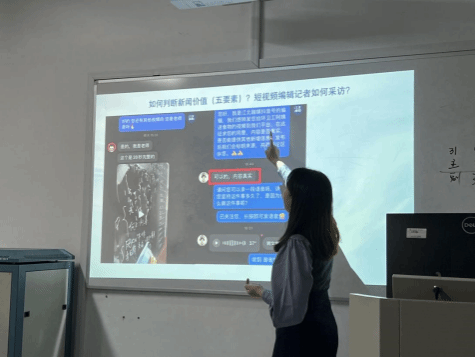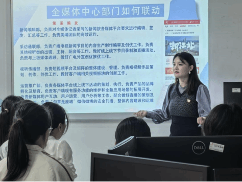随后,她围绕“新闻理想与新闻业务讨论”“全媒体中心如何联动”“短视频出镜记者工作”以及“实习投稿途径”这四个方面,详细分享了自己在全媒体中心的工作实践经历。她引经据典地向学生强调:新闻理想不仅是对真实、客观、公正的坚守,更是推动新闻业务不断创新和发展的动力源泉。同时,还结合"中央厨房"的概念,介绍了江北区全媒体中心不同部门之间的协作机制,开阔了同学们的视野。在谈到实习和投稿途径时,她鼓励学弟学妹们要勇于尝试,积极寻找、稳稳抓住实践机会,通过实习来提升自己的专业技能和综合素质。在最后的问答环节,她耐心回答了同学们在升学、就业、人生规划等方面的困惑,并给出了切实可行的建议。并鼓励大家要保持对新闻事业的热爱和追求,不断提升自己的专业素养和实践能力,为未来的职业发展打下坚实的基础。