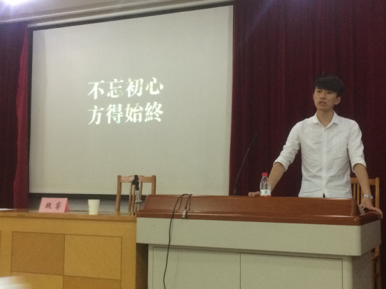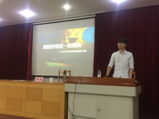 下午3时10分,讲座正式开始。魏睿首先由“梦想”引入,告诉同学们他的梦想其实就是一直画画,由此展开其从小到大的发展历程。魏睿小时候酷爱画画,并展现出优秀的天赋,坚持画画。高考之后,魏睿来到了自拍 ,进入阳明学院学习。大一的时候,四处兼职,却坦言自己十分迷茫。进入大二,从阳明学院到自拍 ,魏睿选择广告为自己的专业,并开始自己的创业之路。