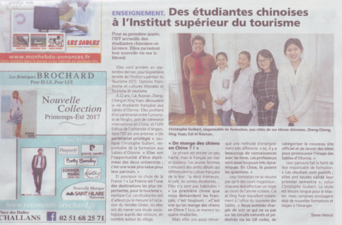 同时,近期,法国度假小城LES SABLES出版的报纸LES SABLES专门采访了人文学院在昂热大学旅游与文化学院Sables-d’Olonne校区就读的 4名13级旅游管理中法合作专业本科学生。昂热大学旅游与文化学院去年秋季在大西洋畔的度假小城LES SABLES开办了第4个校区,首期开设了海滨文化与遗产、旅游与水上运动2个本科专业,法国现外长、前总理埃罗专程前往参加揭幕典礼,还接见了在该区就读的我院旅游管理中法合作本科专业2013级的6位女生,当时多家法国媒体以及福建东南卫视曾有专门报道。本次宁大学生再次引起关注,LES SABLES报道提到宁大的这4位学生是昂热大学Sables-d’Olonne校区的首届学生,受益于自拍
