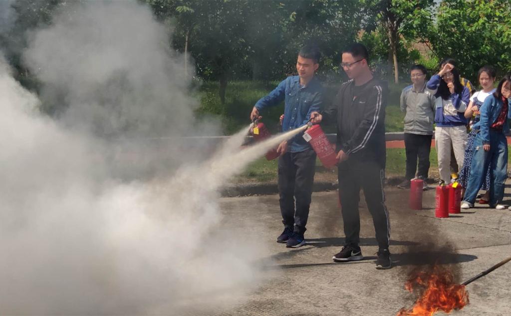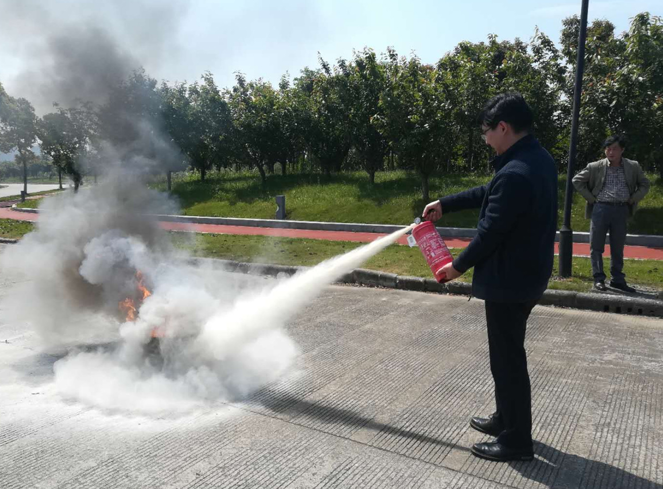 保卫处徐老师向大家详细讲解了消防安全注意事项,科普了消防安全基础知识,重点讲解了灭火器的构造、使用方法、灭火操作步骤和禁忌事项等。本次安全演习使用的是较常用的干粉灭火器,其是利用二氧化碳气体或氮气气体作动力,将瓶内的干粉喷出灭火的。干粉是一种干燥的、易于流动的微细固体粉末,由能灭火的基料和防潮剂、流动促进剂、结块防止剂等添加剂组成。