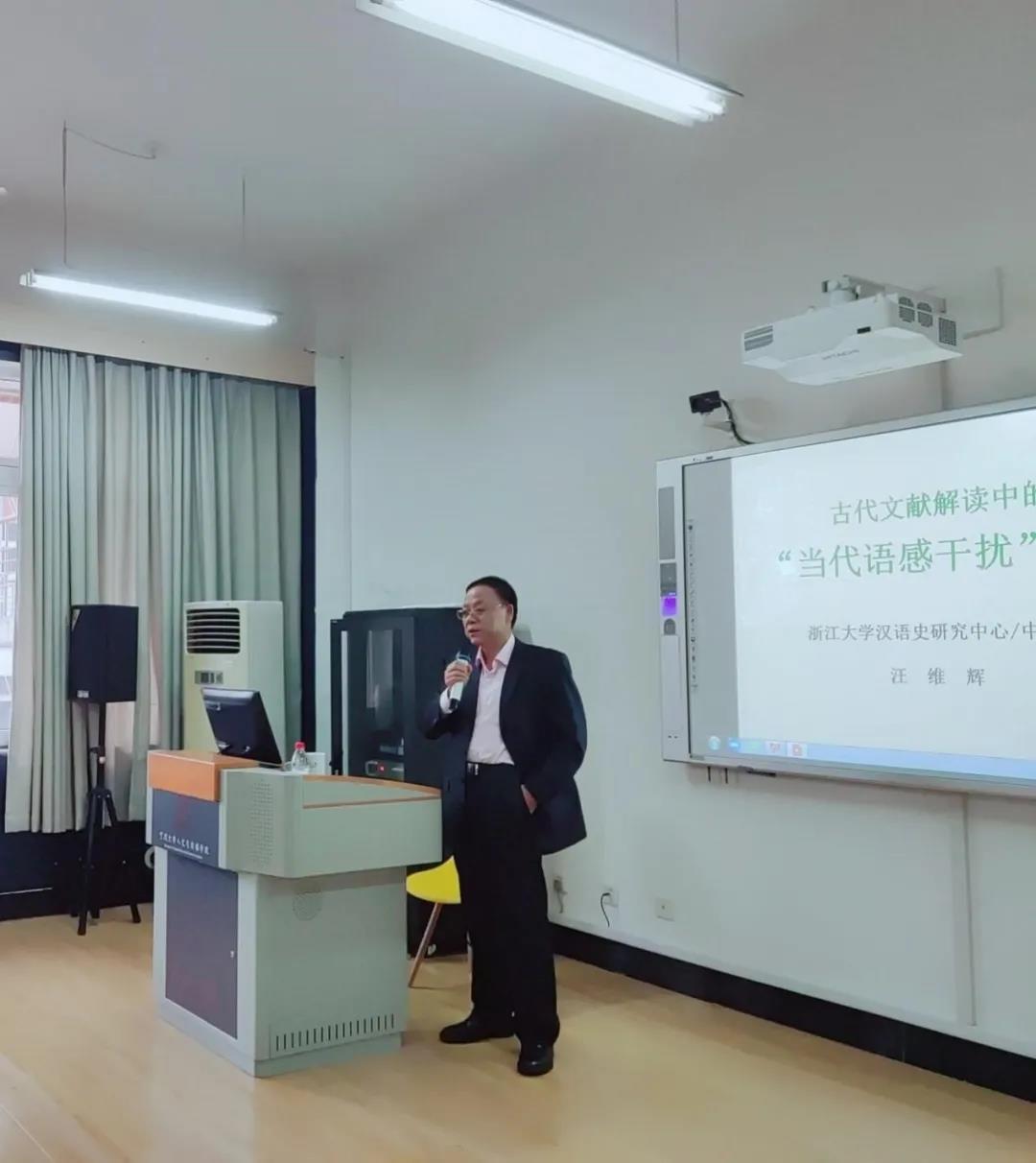 2021年11月5日下午,浙江大学求是特聘教授、教育部重点研究基地汉语史研究中心主任、中国语言学会副会长、博士生导师汪维辉教授应邀作了题为“古代文献解读中的‘当代语感干扰’问题”的学术报告。讲座由中文学系主任聂仁发教授主持。