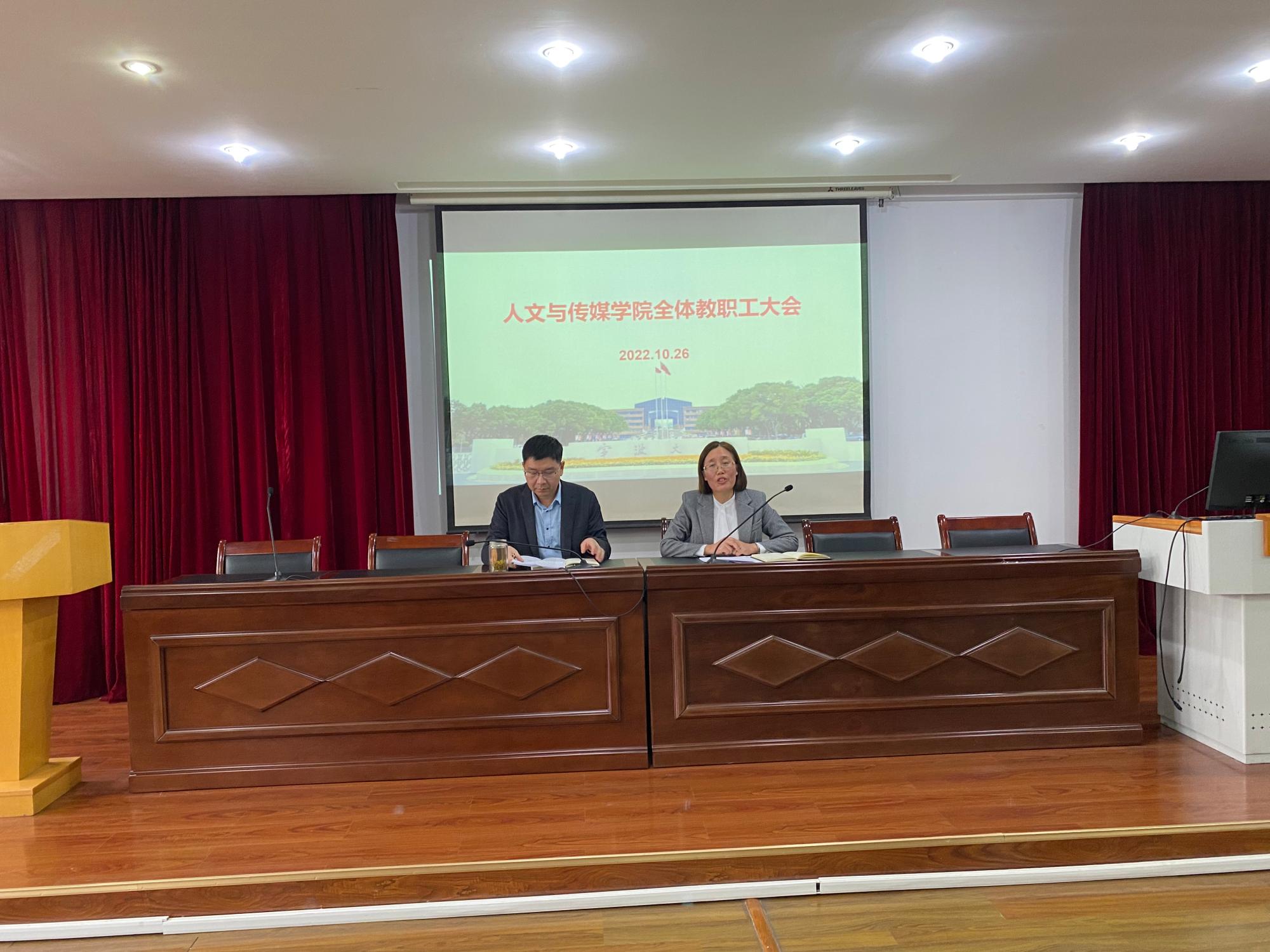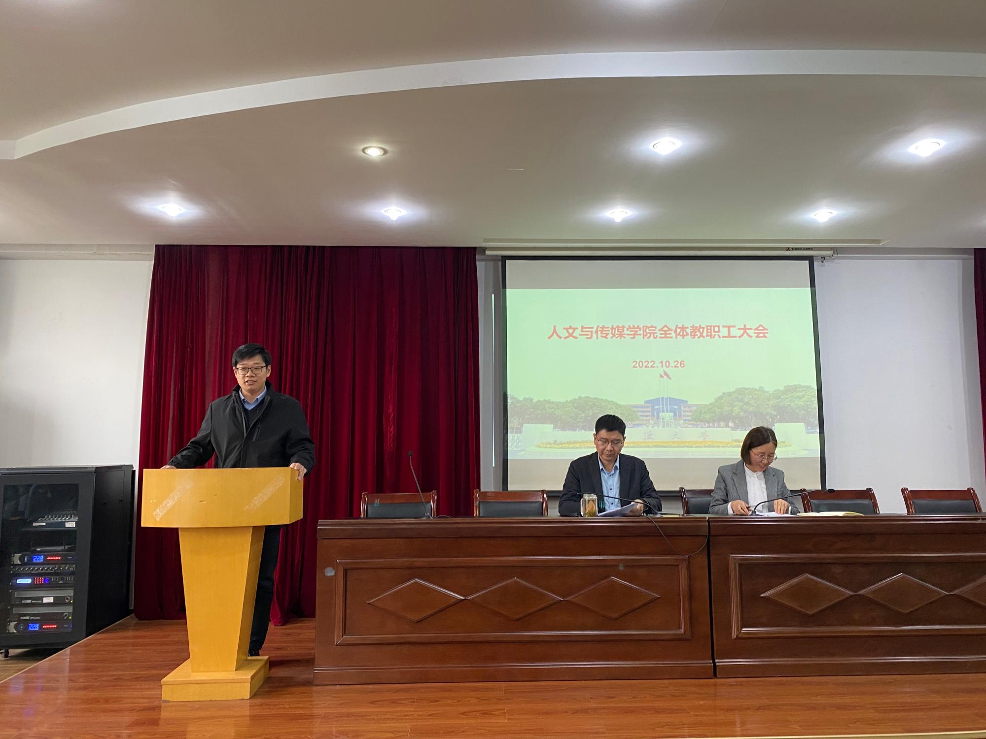 会上,张佩芬书记向全院教职工传达了党的二十大精神。她要求全体教职工增强政治自觉,深刻领会大会精神;增强理论自觉,学深悟透大会报告;增强行动自觉,持续推进各项工作。她强调老师们要以党的二十大精神为指导,努力贯彻落实立德树人根本任务,践行为党育人为国育才初心使命,不断提高人才培养水平,努力培养德智体美劳全面发展的高素质人才,为全面建设社会主义现代化国家,全面推进中华民族伟大复兴贡献教育力量;要结合我们学院的专业、学科优势和特色,主动服务国家战略,提升科研创新能力、文化创新能力,发展社会主义先进文化,为增强中华文明传播力影响力贡献人文力量。