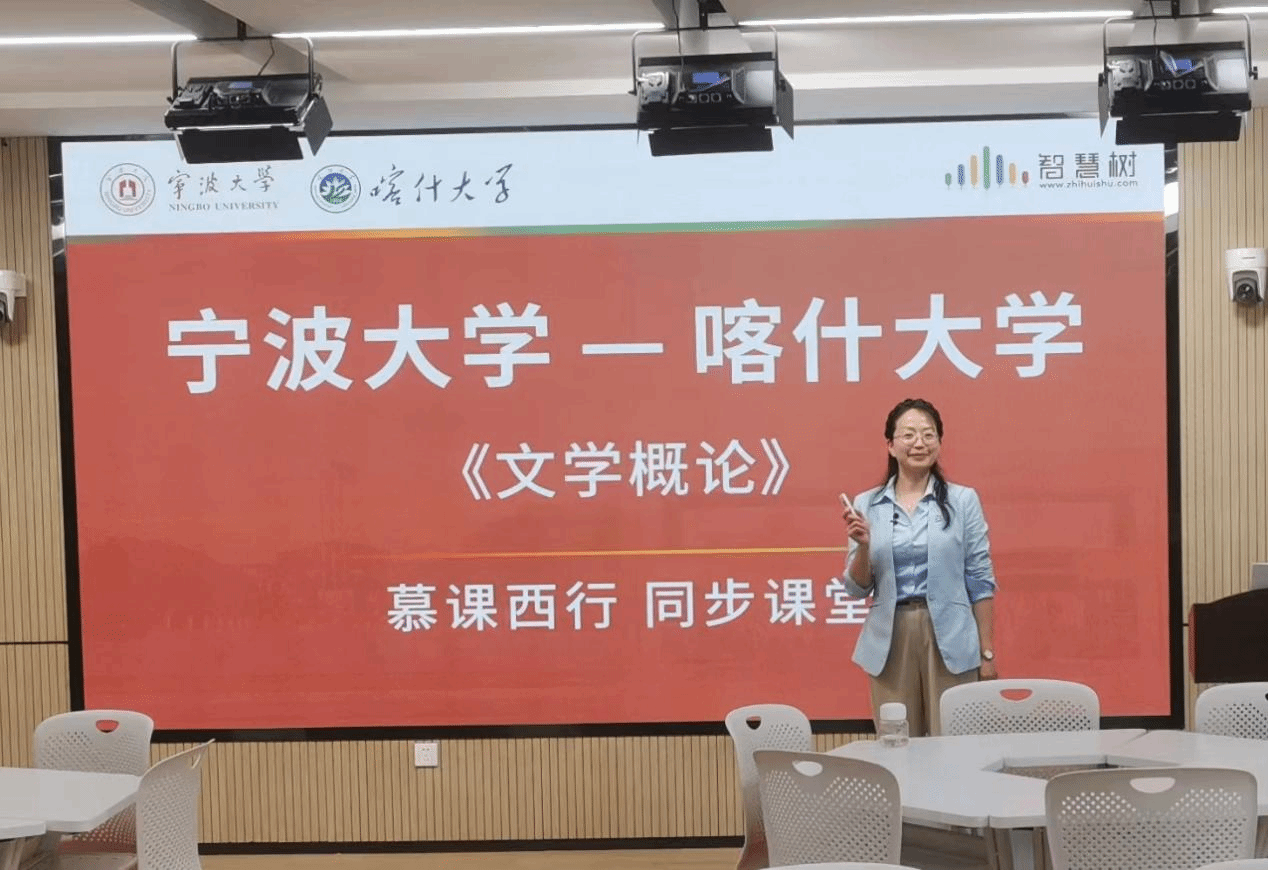 省级一流课程主讲教师胡泽球副教授与喀什大学人文学院杨波教授、再纳汗·阿不多副教授共同开展了《文学概论》课程的“同步课堂”直播教学和在线教研活动,这是东西部教育资源实现共享共创的一次推进,也是中西部教师教育教研相互碰撞的一次火花。